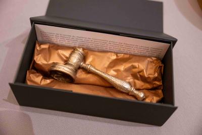 Moment très commenté par les invités : la remise d’une petite sculpture en bronze représentant un marteau de commissaire-priseur.